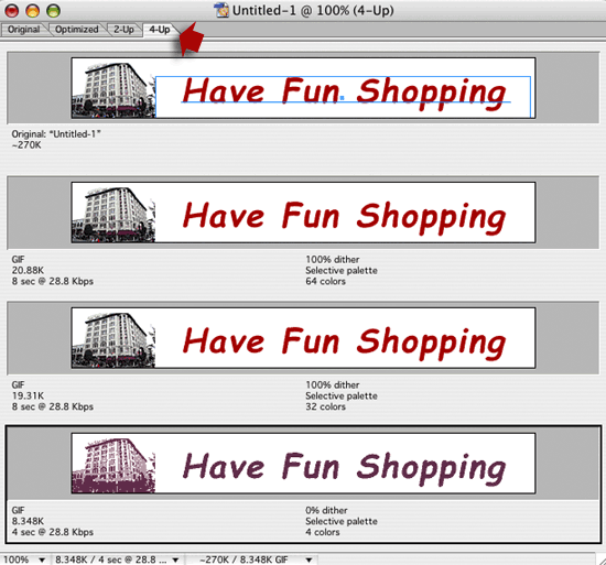 Above, the “Four-up” view is selected using the tabs at top of screen (red arrow), so you can compare different optimization settings. Note that the bottom choice shows too few colors used, and so your banner does not display properly.